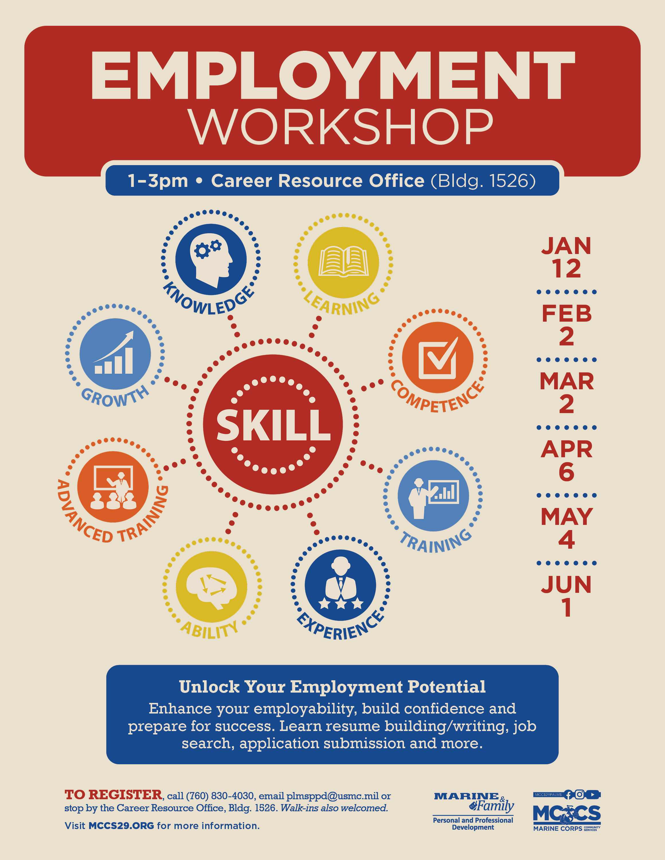 To REGISTER, call (760) 830-4030, email plmsppd@usmc.mil or stop by the Career Resource Office, Bldg. 1526. (Walk-ins also welcomed).
