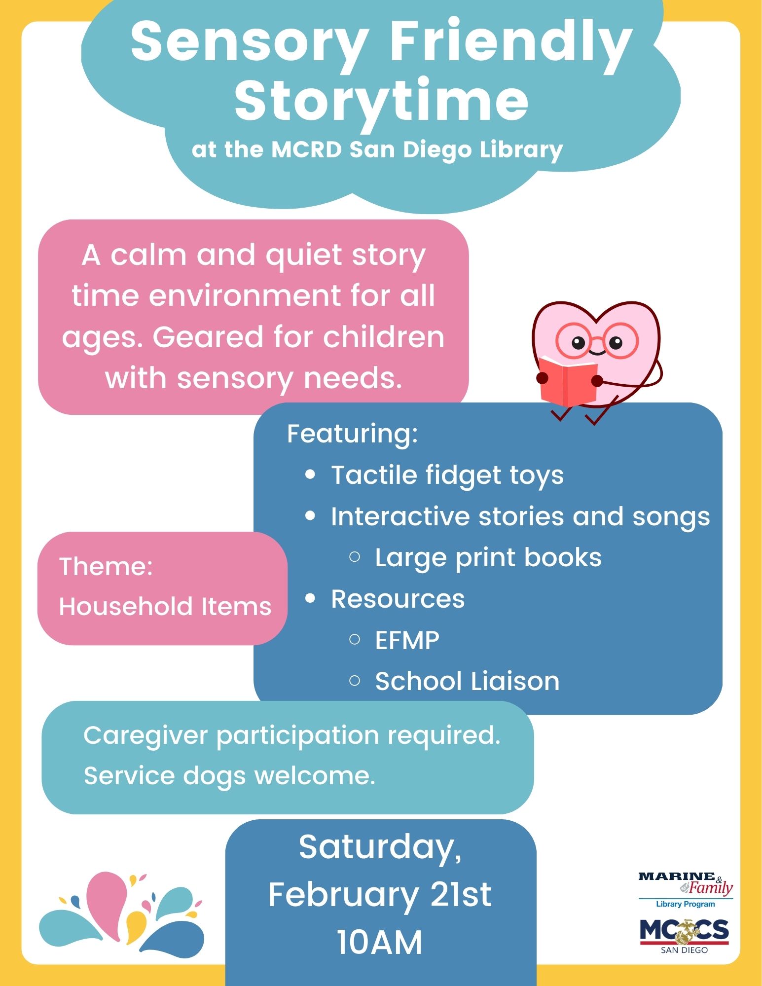 Join the Library for a calm and quiet story time for all ages. Geared for children with sensory needs. Featuring tactile fidget toys, interactive stories and songs, large print books, and resource tables.
