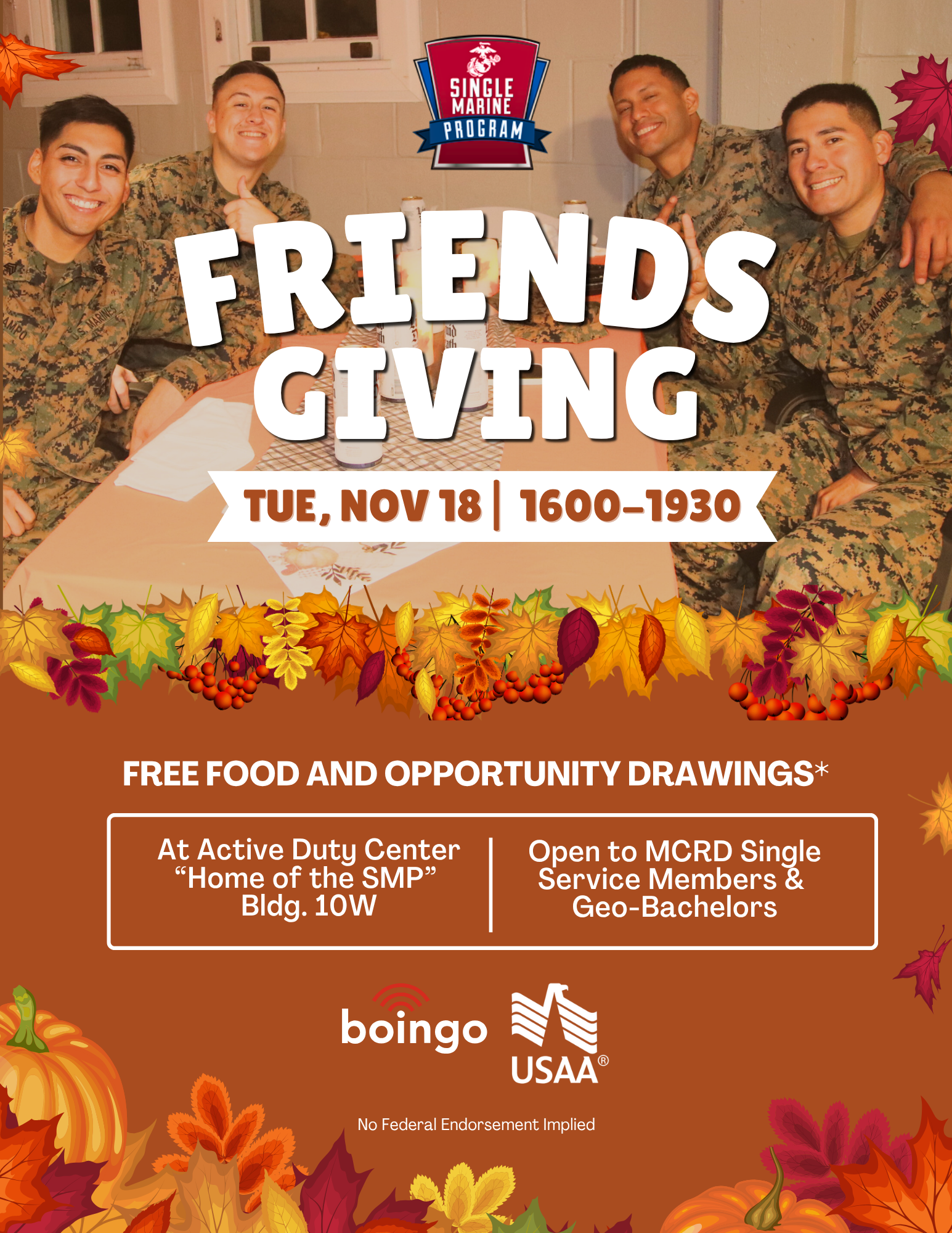 Join us for a holiday meal and opportunity drawings at the Active Duty Center from 1600 to 1930! Open to MCRD Single Service Members & Geo-Bachelors.