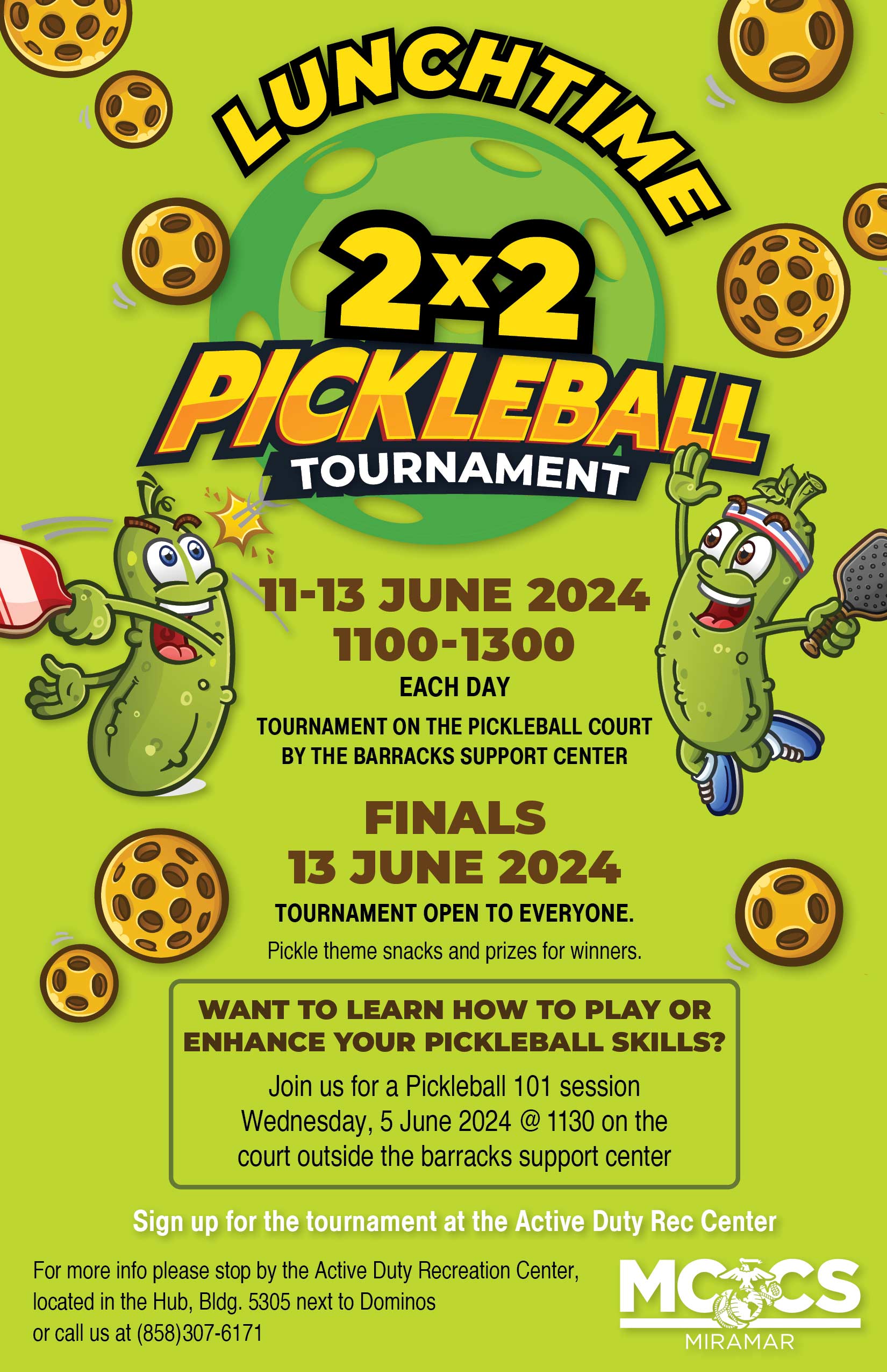 2x2 Pickleball Tournament from June 11 to 13, 11:00 am to 1:00 pm every day. Pickleball Court by the Barracks Support Center.