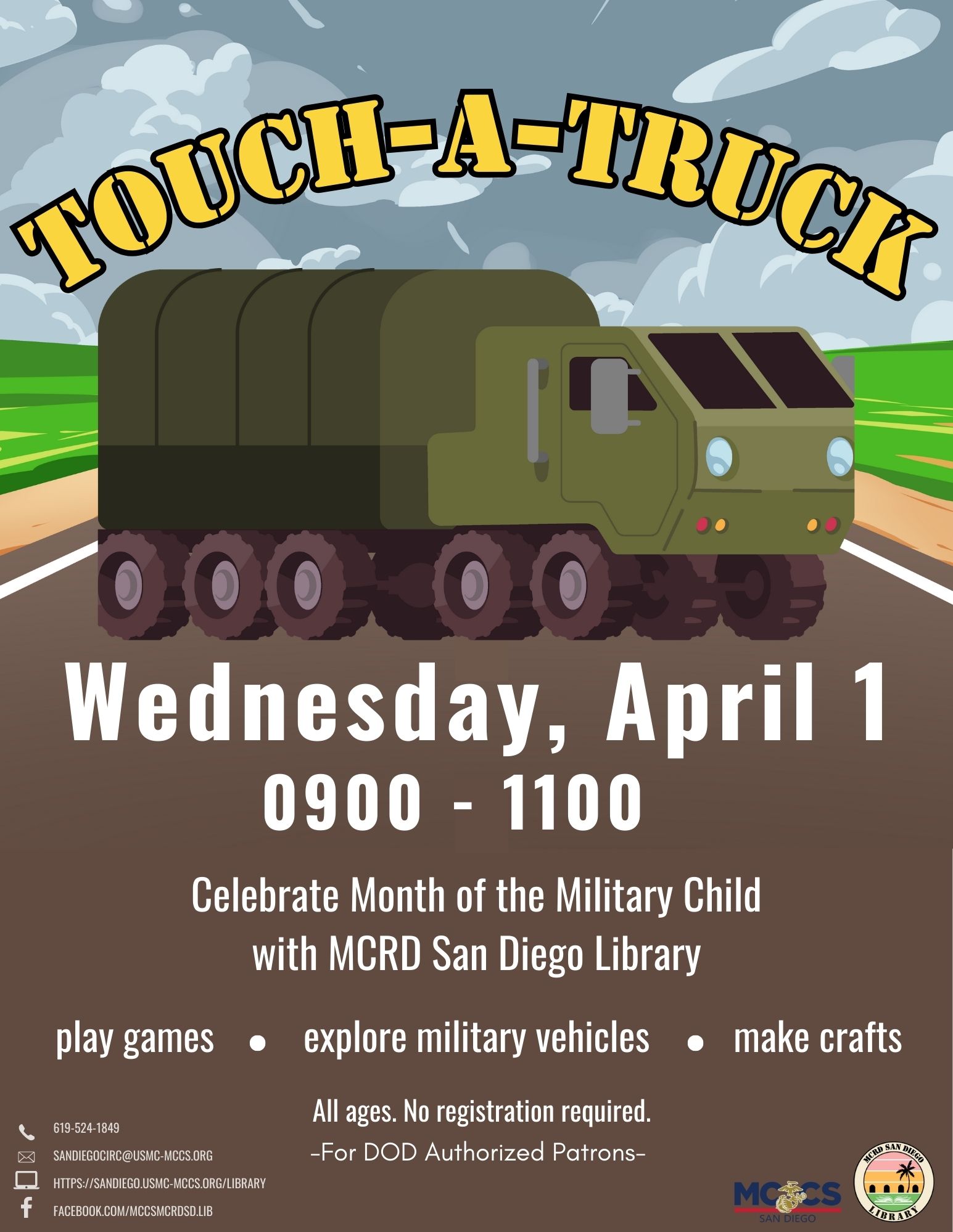 Celebrate Month of the Military Child with the MCRD Library! Explore military vehicles in the library parking lot. Then come inside for games, crafts, and MCCS resource tables. Open to all authorized patrons, no registration required.